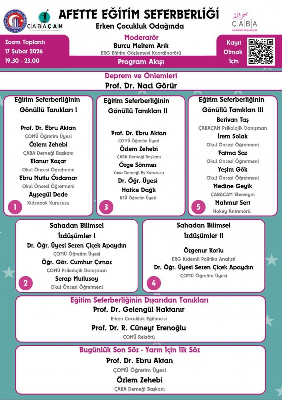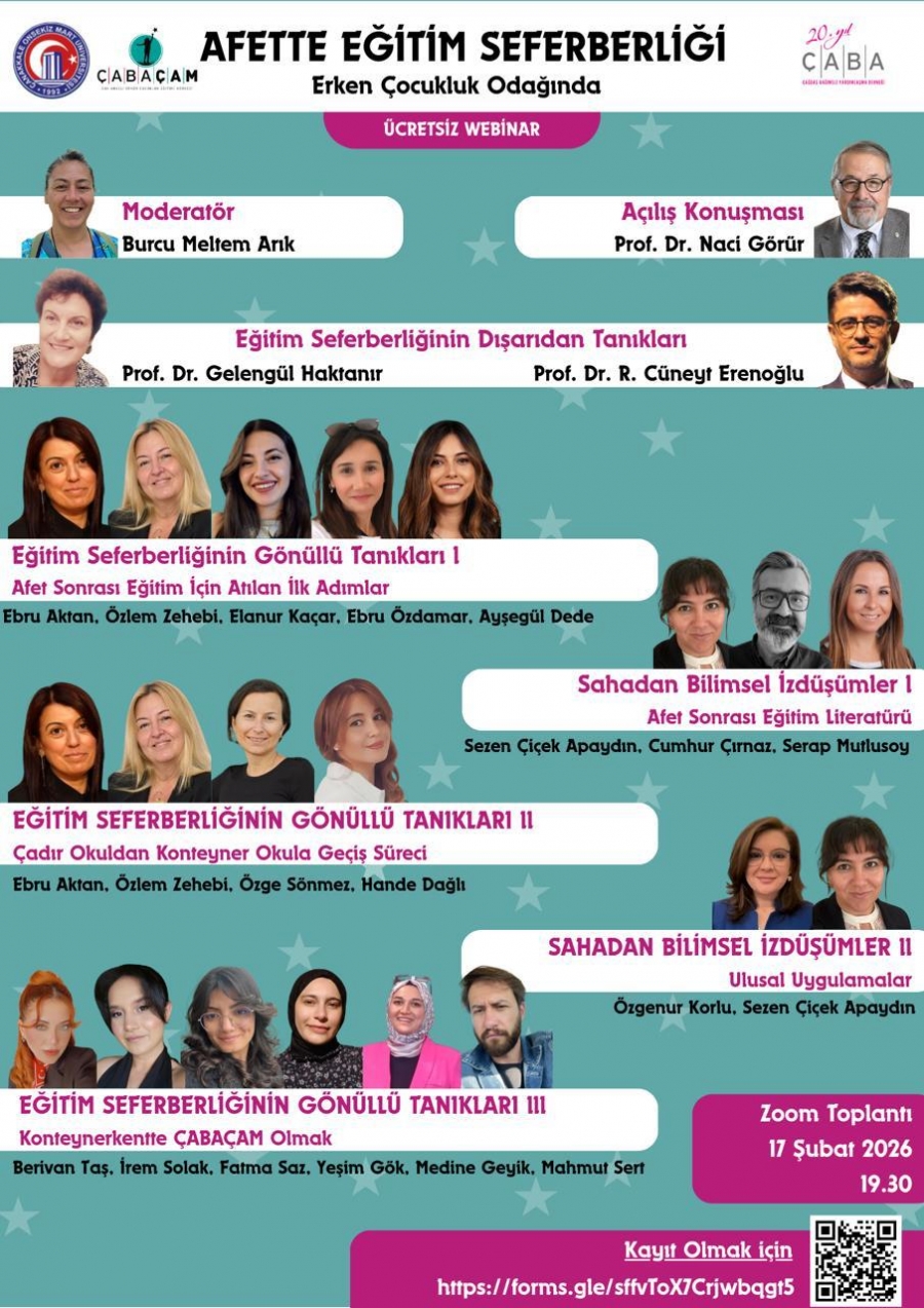 Çanakkale Onsekiz Mart Üniversitesi ÇABA Çok Amaçlı Erken Çocukluk Eğitimi Merkezi (ÇABAÇAM) olarak ÇABA Derneği öncülüğünde depremden büyük zarar gören Kahramanmaraş ve Adıyaman illerinde kurulan iki ayrı çadırkentte oluşturulan 3-6 yaş arasındaki okul öncesi dönem çocuklarına yönelik Adıyaman’da iki Kahramanmaraş’ta bir olmak üzere 3 ayrı ÇABAÇAM Eğitim Destek Biriminin toplamda üç yıl devam eden çalışmalarını anlatan webinar düzenlendi.
